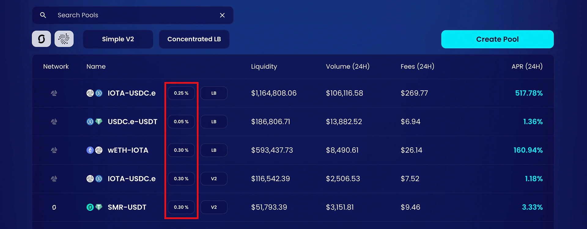 <figure><img src="https://3298136148-files.gitbook.io/~/files/v0/b/gitbook-x-prod.appspot.com/o/spaces%2FQKXYjSjojT8bZB2EGMXu%2Fuploads%2FsXlU0jrKtD2k9wmLveOD%2FDynamic%20Fees.webp?alt=media&#x26;token=62e26d52-bd0e-4d10-9bad-eff21532d830" alt=""><figcaption><p>Dynamic Fees on the All Pools page</p></figcaption></figure>
